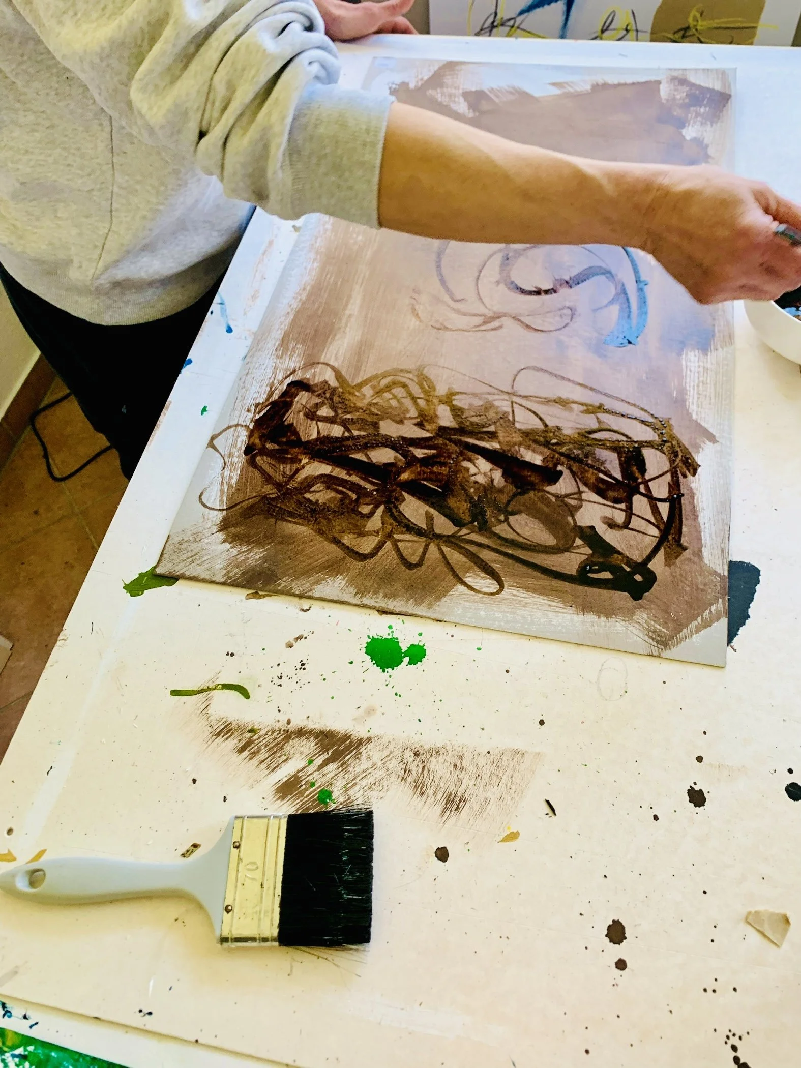 Wir arbeiteten fünf Stunden, mit Pausen, mit Gesprächen, mit Stille. Kein Kurs, kein Programm, kein Erwartungsdruck. Nur Materialien, Leinwand, Papier – und die Bereitschaft, etwas entstehen zu lassen. Am Ende des Tages gab es ein abstraktes Acrylbild auf einer 80×40 cm Leinwand, mehrere Aquarellstudien und den Beginn eines Schichtenmalerei-Projekts, das wir angelegt haben und das weitergeführt werden will.